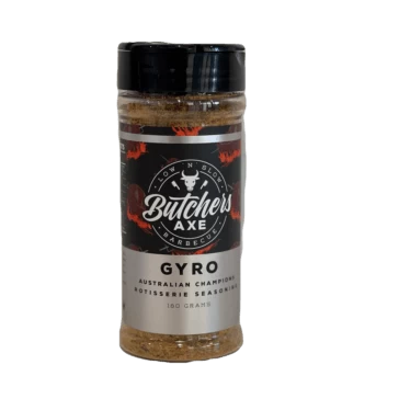 Fire Meat and Gyro- Something special happens when the juices drop and hit the white hot coals. Gyro will transport you to any part of the world where meat is slowly rotated over fire. Use Gyro on your souvlakia, Kebabs, Shawarma, charcoal chicken and any other rotating meats! Gyro also pairs well with veggies and other Mediterranean Dishes.Â