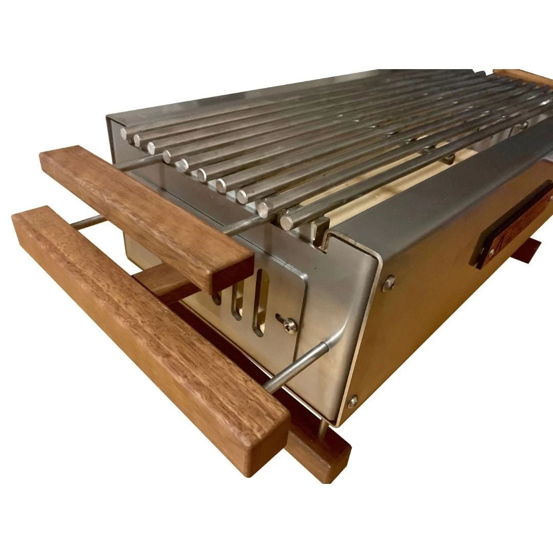The polished stainless steel body is easy to keep clean, and the heat-retaining bricks inside make for efficient use of charcoal. An insulated grill body means you can cook directly on your table without risk of damage.