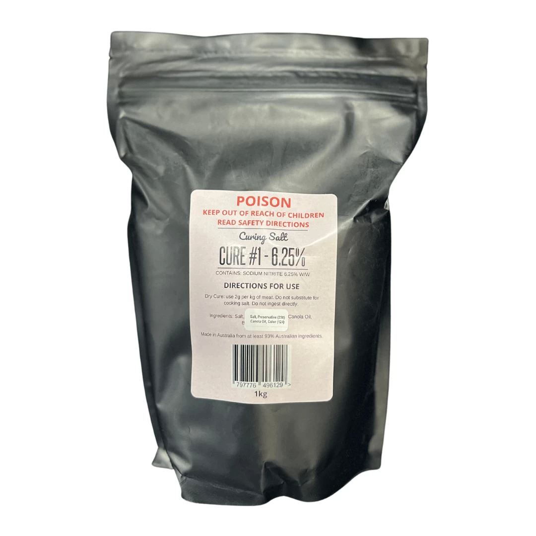 Cure #1 6.25% – Cure #1 6.25% is 6.25% nitrite, 93.25% salt, died pink for safety reasons. Made in Australia, it is designed for curing process between 3 and 10 days. Ideal for making bacon, ham and a range of sausage and other small goods.