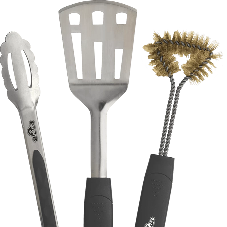 Every grill master needs a sturdy spatula, tough tongs, and a good grill brush. This Napoleon 3 Piece Stainless Steel Multi-Tool Set has it all. All tools are made from durable stainless steel because barbecue tools take a beating and need to be tough. The heat resistant handles are comfortable to hold making flipping burgers and turning steaks a breeze. Don’t get caught without a bottle opener, every end of this tool set is equipped with a bottle opener end that doubles as a tool hanger so that your tools are always in reach. The 3-sided grill brush has brass bristles, which are ideal for our porcelain coated cast iron cooking grids. When it comes to cleanup, it’s a breeze because they’re dishwasher safe. Be prepared for whatever you want to grill up with this Napoleon 3 Piece Stainless Steel Multi-Tool Set.