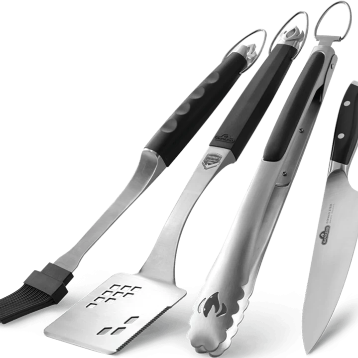 Napoleon’s Executive 4 Piece Toolset is made from cast stainless steel with comfortable ergonomic handles. The only knife you will ever need, the Napoleon Executive Chef Knife is made from German steel and razor sharp; it’s the ideal all-purpose knife. The large spatula is perfect for steaks and other large food with its bladed tip and serrated edge. The easy-lock stainless steel tongs are always ready for action, their comfortable grip making it easy to grasp and move your grilled delicacies. Don’t forget to splash on the sauce with the silicone basting brush. Be the boss of your grill with the Napoleon Executive 4 Piece Toolset.