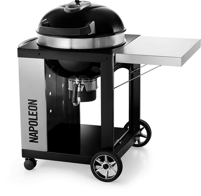Charcoal enthusiasts can experience a full-sized grilling experience with the compact and mobile Napoleon PRO Charcoal Kettle Grill with Cart. The stainless steel, folding side shelf provides a generous prep space. The folding shelf isn’t the only thing that is spacious, there is also the large, hinged, cast iron cooking grid. You’ll know it’s a Napoleon with the iconic WAVE™ cooking grids for those distinctive sear marks. Grilling, roasting, and smoking are a breeze, the hinged grids season like a cast iron frying pan, and make it easy to reload charcoal or add wood for smoking. Charcoal is all about controlling heat and airflow, the cooking grids adjust to three heights, while the stainless steel heat diffuser evenly distributes heat, and directing spent charcoal to the ash catcher. The lid features an offset hinge that opens, allowing access to the whole grill while keeping your hands away from the heat.