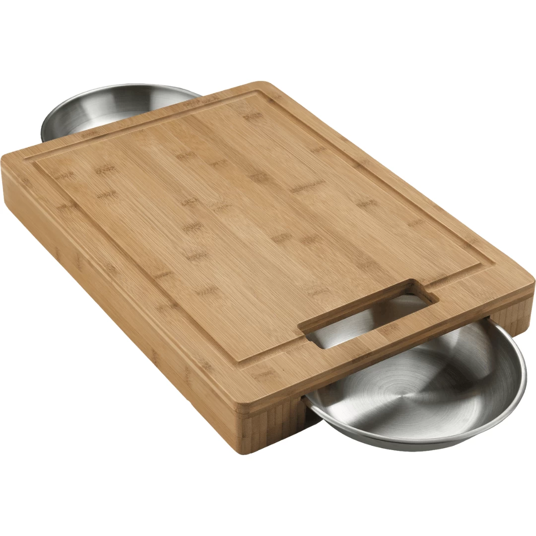 The Pro Carving/Cutting Board with two stainless steel bowls, offers a high quality cutting board that completes the ultimate BBQ preparation space. The high quality bamboo cutting board has an anti-bacterial surface and is perfect for preparing foods for your grill. The two stainless steel bowls are conveniently tucked inside the design to capture juices or food you’re cutting for easy transport to your grill or cooktop.