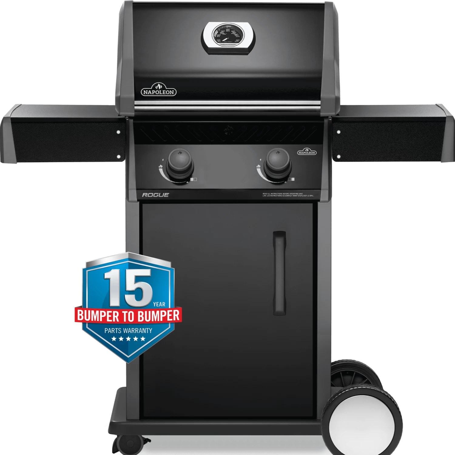 Napoleon Grills Rogue ยฎ 365 Gas BBQ is perfect for a seasoned griller who needs a quality grill that takes up the space of something a little more portable. It even has the price tag to match. Grill different by going Rogueยฎ. Two main burners on this compact grill provide perfect heat for the 460 square inches of grilling area. This means you can still grill for a crowd and make your (sear) mark with stunning culinary creations. Youโll know itโs a Napoleon with the iconic WAVEโข cooking grids for those distinctive sear marks. The dual level sear plates instantly vaporise any grease that falls from your food, creating flavour, not flare-ups. This BBQ has a stylish and durable porcelain enamel lid and single panel door. With this new design, you will be grilling faster; assembly time is cut in half. The cabinet itself provides integrated storage for propane and grilling tools. The Rogueยฎ fits itself into your life and lifestyle.ย Use this BBQ for more than just searing up the perfect steak; use it to bake roast, and smoke tooย using the Cast Iron Charcoal and Smoker Trayย (**Accessory sold separately**).ย So get out there and grill different. Go, Rogue.