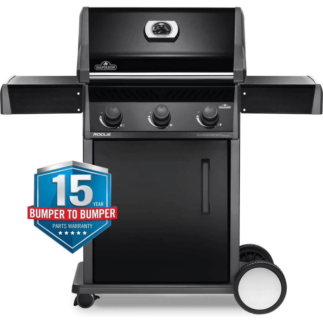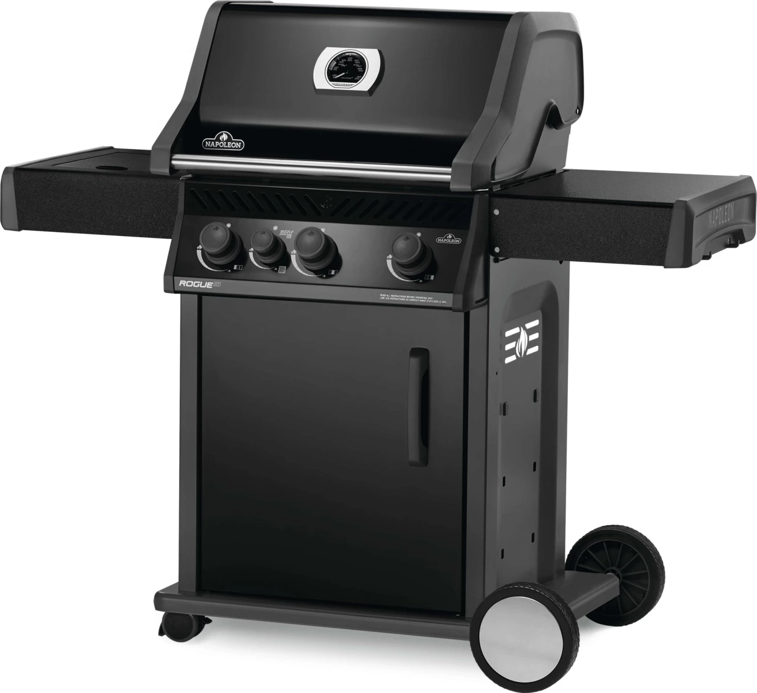 Napoleon Grills Rogue ยฎ 425 Gas BBQ is perfect for a seasoned griller who needs a quality grill that does more than justย sears up the perfect steak; use it to bake, roast, and smoke too. It even has the price tag to match. Grill different by going Rogueยฎ. Three main burners on this compact grill provide perfect heatย across the grilling area. This means you can still grill for a crowd and make your (sear) mark with stunning culinary creations. Youโll know itโs a Napoleon with the iconic WAVEโข cooking grids for those distinctive sear marks. The dual level sear plates instantly vaporise any grease that falls from your food, creating flavour, not flare-ups. This BBQ has a stylish and durable porcelain enamel lid and single panel door. With this new design, you will be grilling faster; assembly time is cut in half. The cabinet itself provides integrated storage for propane and grilling tools. The Rogueยฎ fits itself into your life and lifestyle.ย Plus, you can turn your favorite Napoleon gas grill into a charcoal grill and smoker for smoky charcoal flavor using the Cast Iron Charcoal and Smoker Trayย (**Accessory sold separately**).ย So get out there and grill different. Go, Rogue.