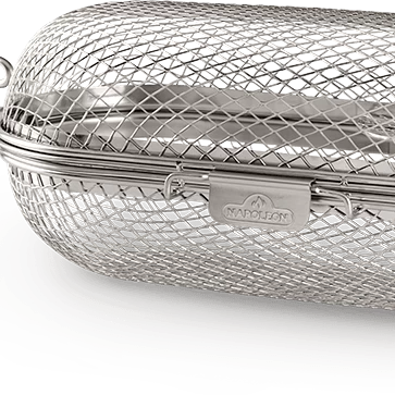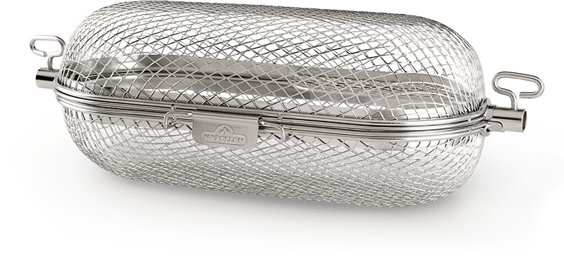 Things just taste better when they’re barbecued and with the Napoleon Rotisserie Basket it’s easy to make wings, french fries, and so much more right on the grill. The Rotisserie Basket’s rod ports fit most rotisserie rod styles and lock in place with the thumb screws. Once you’ve created the most delicious wings, crispiest fries, and grill roasted veggies without the addition of oil, the stainless steel baskets clean up easily, then nest for space saving storage.