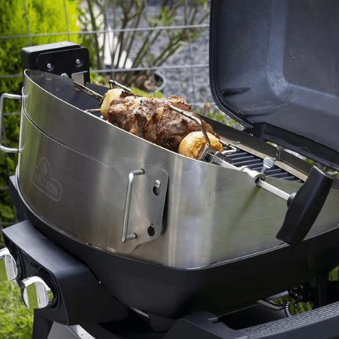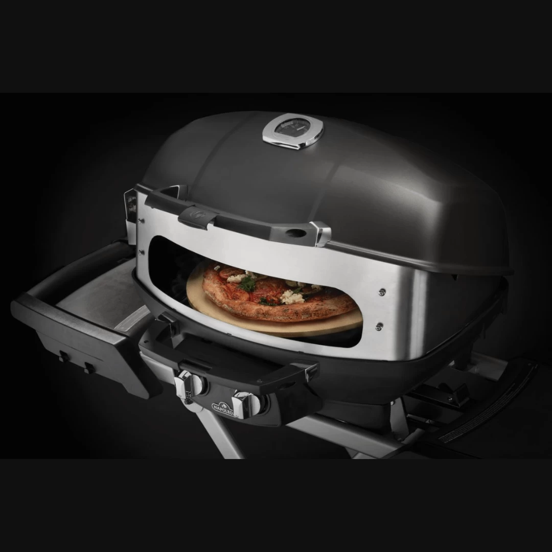 Turn your Napoleon TravelQ grill into a pizza oven and rotisserie grill. This innovative design with detachable door creates evenly cooked and perfectly crisp pizza. With the enclosed design it creates evenly cooked and crispy meals.